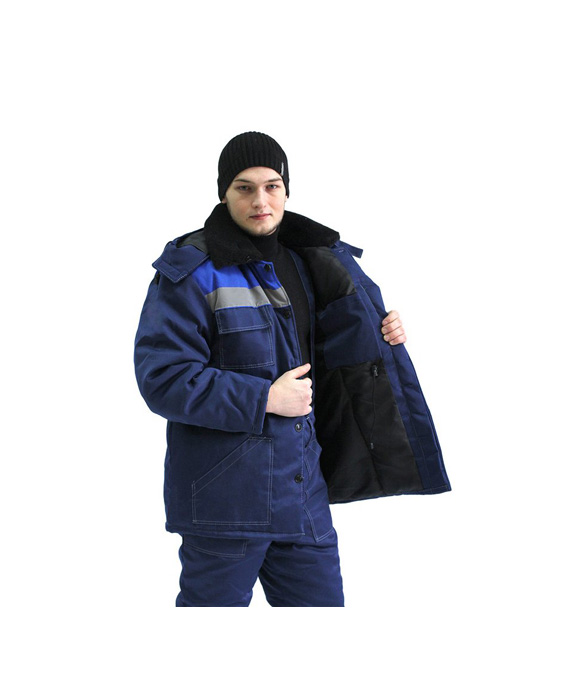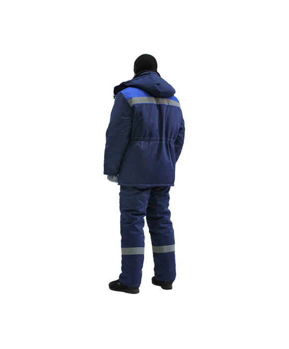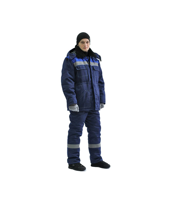 Классическая модель утепленного костюма с контрастной отстрочкой по швам. Куртка с супатной застежкой на пуговицы, СОП по линии васильковой кокетки . Воротник из искусственного меха. Съемный регулируемый капюшон. На куртке два нижних накладных кармана с косым входом и два нагрудных кармана с клапанами. Регулировка объема по линии талии. Рукава с внутренними трикотажными манжетами.